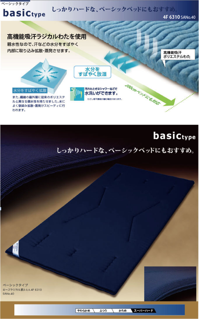 メーカー希望小売価格はメーカー商品タグに基づいて掲載しています 【ROSE RADICAL MAT】 京都西川の健康敷布団 ローズラジカル ベーシックタイプ(スーパーハード) シングルサイズ【送料無料】 側 地:ポリエステル100% (吸汗ポリエステルニット) 詰めもの:ポリエステル100% (高機能吸汗ラジカルわた) 防ダニ加工(忌避)不織布入り 重 量:3.3kg サイズ:100X200X約4cm カラー:ブルー(日本製) 【こちらの商品は大型商品サイズとなっております】 [配送につきまして] 配送業者の指定はお受けできません。
