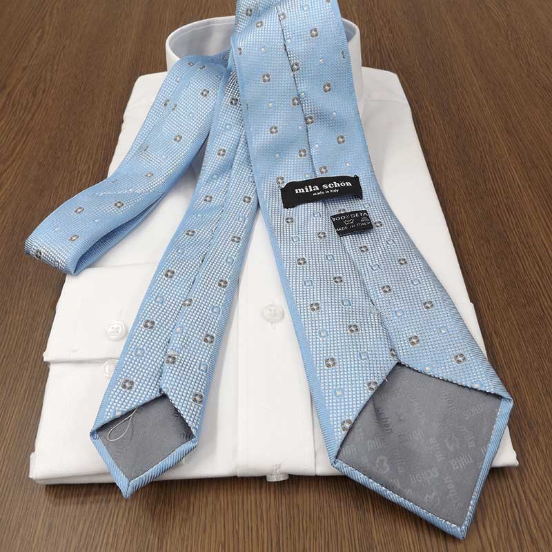 DETAILS 商品名 【Mila Schon】ミラショーン ネクタイ 品番 MS147 カラー (ベース/デザイン) ライトブルー/ベージュ 素 材 シルク 100% サイズ 幅9cm 原産国 イタリア(MADE IN ITALY) 付属品 ミラショーン社製ケース WRAPPING ラッピングをご希望の場合は、ミラショーン社製ケースに入れて、リボンを掛けてお届けします。